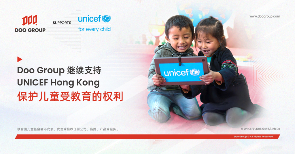 Doo Group 欣然宣布延长与联合国儿童基金香港委员会(UNICEF Hong Kong)的合作关系。Doo Group 自 2022 年 4 月起通过参与“亚洲学童计划”(Schools for Asia)为弱势儿童提供更好的学习条件,保护其受教育的权利。
