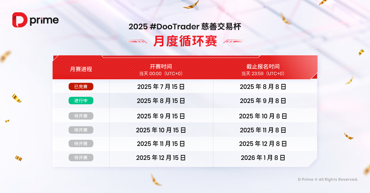 2025 年 D Prime #DooTrader 慈善交易杯首轮月赛于 8 月 14 日 23:59(UTC+0)圆满落幕,第一轮榜单已火热出炉!第二轮月赛紧随开启,已于 2025 年 8 月 15 日 00:00(UTC+0)鸣锣开战 —— 欢迎各路交易高手即刻报名,争夺决赛入场券!