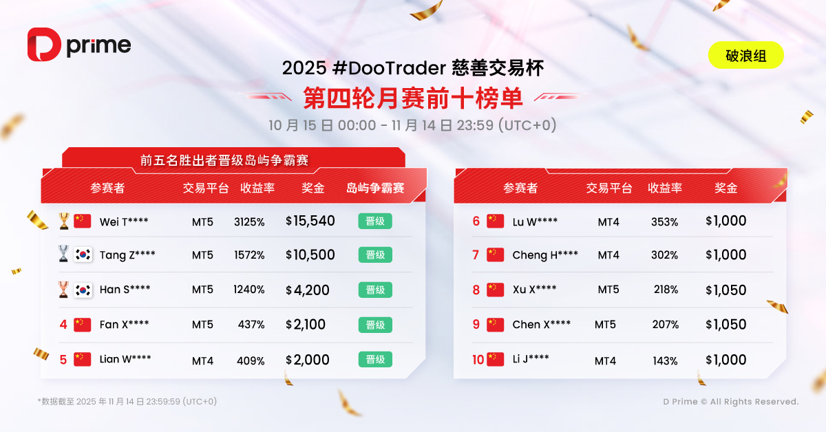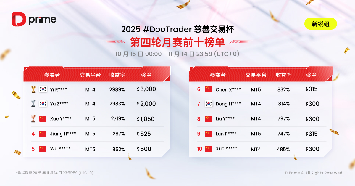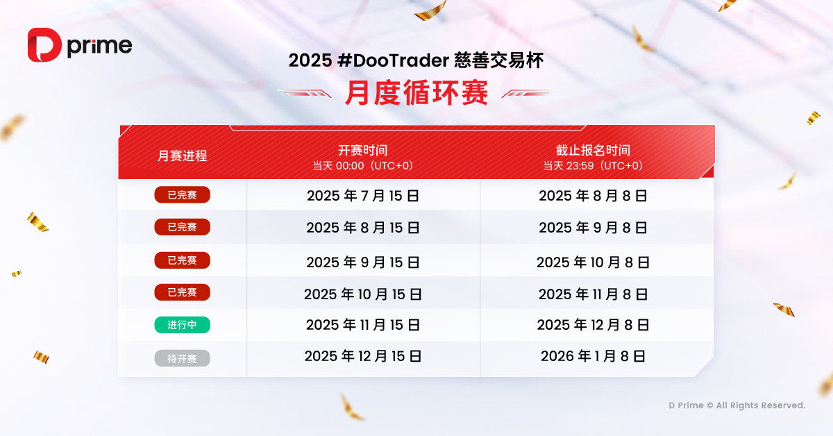 2025 年 D Prime #DooTrader 慈善交易杯第四轮月赛已于 11 月 14 日 23:59(UTC+0)顺利收官,赛果榜单火热揭晓!第五轮月赛紧随于 2025 年 11 月 15 日 00:00(UTC+0)开赛 —— 欢迎各路交易高手立刻报名,争夺线下决赛名额!