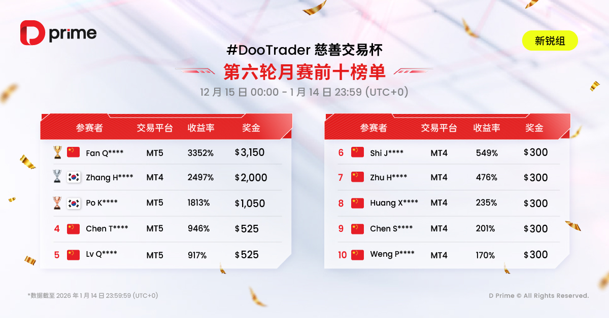 D Prime #DooTrader 慈善交易杯第六轮月赛已于 1 月 14 日 23:59(UTC+0)顺利落幕,赛果榜单火热揭晓!历经半年的鏖战,六轮月赛圆满收官,赛事正式迈入岛屿争霸赛决赛阶段!