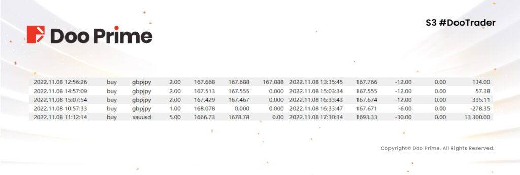 其后在 11 月 7 日至 11 月 8 日期间,由于 XAUUSD 整体行情趋向窄幅震荡,Xue YanqXXX 的交易偏向于耐心和谨慎,但是随着 11 月 8 日 XAUUSD 快速拉升,突破震幅区间,Xue YanqXXX 随即把交易头寸放大至 2 – 10 手,两日收获 5,000+ 的收益。