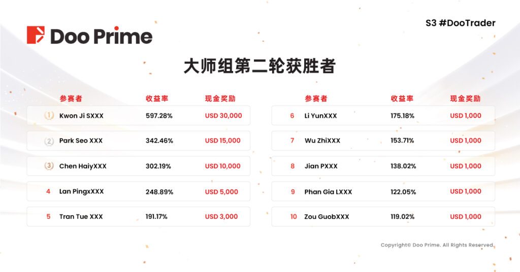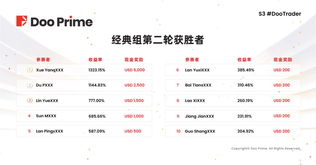 2022 年 S3 #DooTrader 慈善杯全球交易大赛第二轮赛事已于 12 月 14 日圆满结束,至此由 Doo Prime 全力升级打造的本届交易大赛成功落下帷幕。历经近 3 个月的激烈对决,大师组和经典组两轮赛事共 20 位优秀选手,瓜分丰厚奖金,更吸引了来自世界各地的投资高手齐聚一堂切磋交易技艺,引起了业内的广泛关注。