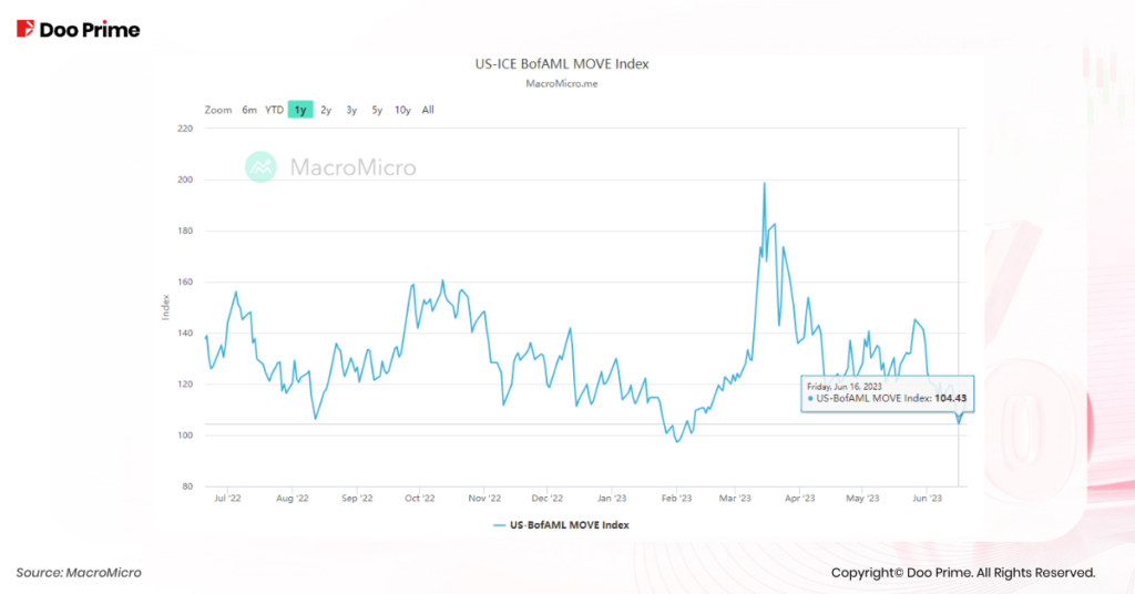 หลังจากเฟดประกาศหยุดการปรับขึ้นอัตราดอกเบี้ยชั่วคราว ดัชนี Merrill Lynch Option Volatility Estimate (MOVE) ซึ่งเป็นมาตรวัดความผันผวนของพันธบัตรรัฐบาลสหรัฐฯ ลดลงมาที่ 104.43 ในวันที่ 16 ใกล้จุดต่ำสุดก่อนเฟดจะดำเนินการขึ้นดอกเบี้ย แนวโน้มนี้บ่งชี้ถึงความเชื่อมั่นที่มั่นคงในตลาดตราสารหนี้และลดความเป็นไปได้ที่จะเกิดการเทขาย (Sell-off)