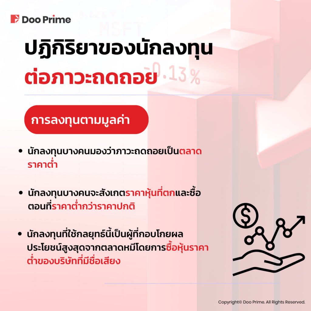 ระหว่างช่วงภาวะถดถอย นักลงทุนบางคนใช้การลงทุนตามมูลค่า (value investing) นักลงทุนจะสังเกตราคาหุ้นที่ตกและซื้อตอนที่ราคาต่ำกว่าราคาปกติ