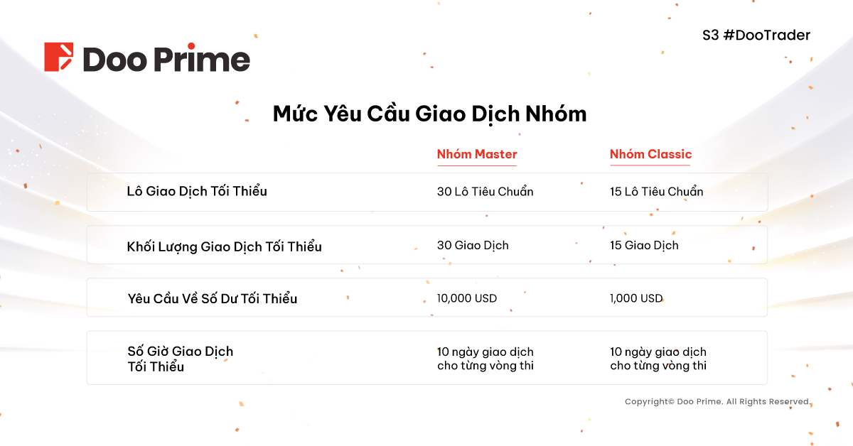 Giống như các mùa giải trước, mùa 3 của #DooTrader chia làm hai nhóm tham gia – Nhóm “Classic” và Nhóm “Master” – nơi những người chơi có thể tự do lựa chọn hạng mục tranh tài cũng như chiến lược giao dịch yêu thích.