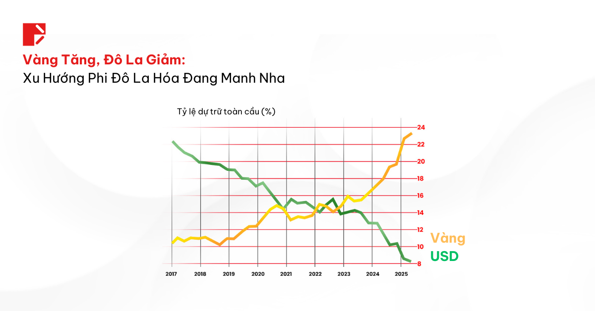 Biểu đồ trên đây cho thấy một bức tranh toàn cảnh hơn: khi tài sản dự trữ toàn cầu đang dần dịch chuyển. Tỷ trọng vàng tăng nhanh, trong khi tỷ trọng đồng USD giảm mạnh. Lúc này, các ngân hàng trung ương đang tiến hành đa dạng hóa tài sản dự trữ, không chỉ bởi vấn đề về lợi suất, mà còn để phòng tránh các biến động từ đồng USD.