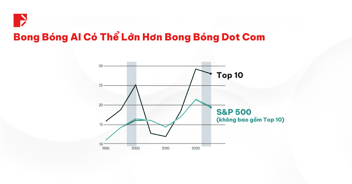 Biểu đồ bên trên đã nói lên tất cả: Năm 2000, top cổ phiếu IT đã làm xuất hiện “bong bóng”. Năm 2025, AI là nhóm ngành thế chỗ cho “người tiền nhiệm”.