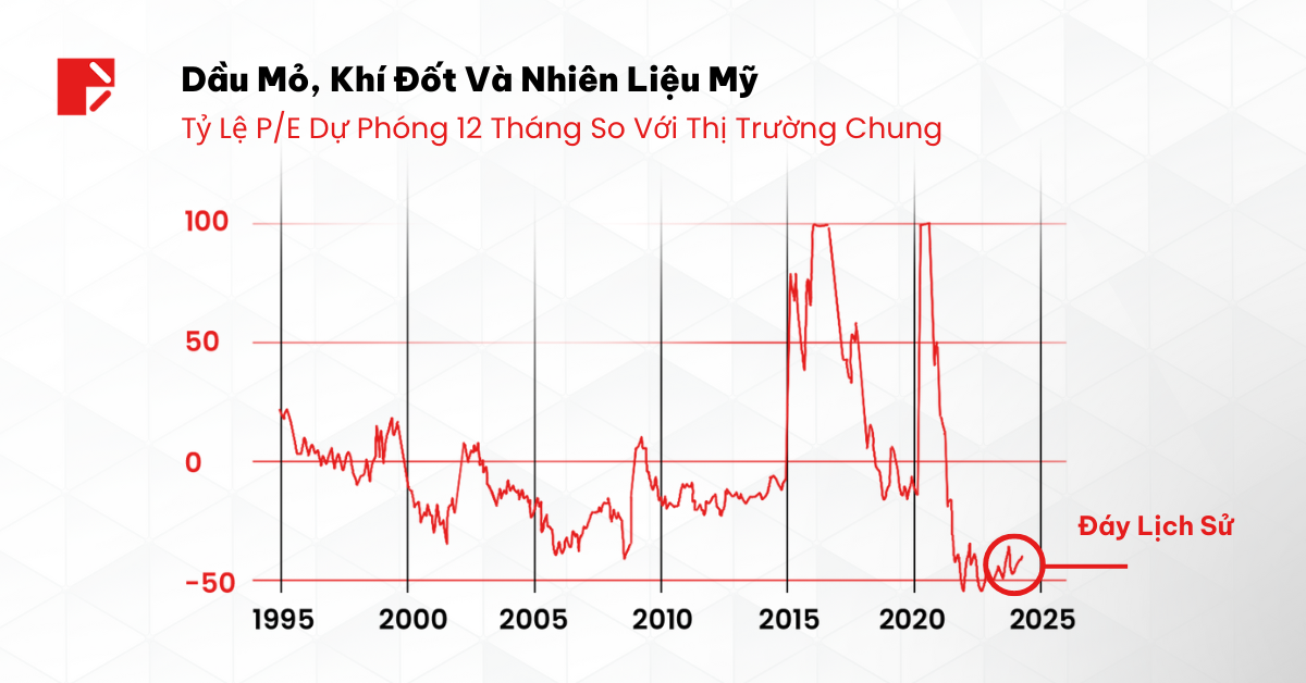 Theo biểu đồ trên, tỷ lệ P/E (giá trên thu nhập) thấp của dầu, khí đốt và nhiên liệu của Mỹ đang ở mức thấp nhất lịch sử xét trên thị trường chung. Điều này có thể là một yếu tố giúp giá dầu tăng cao trong thời gian tới. Tuy nhiên, điều quan trọng cần nắm là định giá thấp không có nghĩa là sẽ có đà mua. Mà ngược lại, đó là sự bất tương quan giữa giá dầu và kỳ vọng của nhà đầu tư về các doanh nghiệp dầu mỏ.