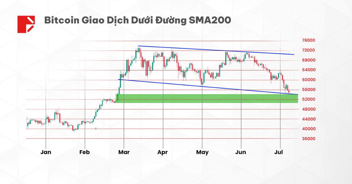 Mô hình giá hiện tại không mấy khả quan cho những nhà đầu tư Bitcoin. Tính tới thời điểm phân tích kỹ thuật vào ngày 8 tháng 7 năm 2024, Bitcoin đang giao dịch dưới đường trung bình động 200 ngày (SMA200) với khối lượng tương đối thấp. Hiện tại, chỉ còn vùng hỗ trợ ở mức loanh quanh 50.000.