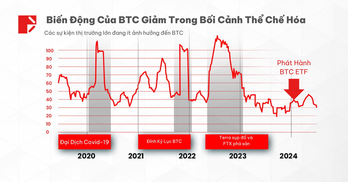Không những thế, kể từ đầu năm 2023 đến này, mức biến động trung bình trong 60 ngày của Bitcoin vẫn ở mức dưới 50%, dù cho sự kiện ra mắt ETFs đã tạo tiếng vang lớn. Đây làm minh chứng cho thấy một thị trường đang trưởng thành hơn và nhận được nhiều niềm tin hơn từng ngày.