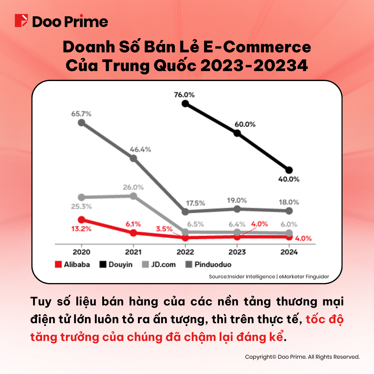 Tuy nhiên, khi xét tới mức tăng trưởng hàng năm của GMV trong ba quý đầu năm, Taobao Group đã tăng gần 3%, JD.com 11%, Pindoudou tăng 22% và Douyin tăng tận 43%. Điều này làm nổi bật lên xu hướng chuyển dịch từ Gian hàng thương mại điện tử sang Thương mại điện tử bằng sáng tạo nội dung.
