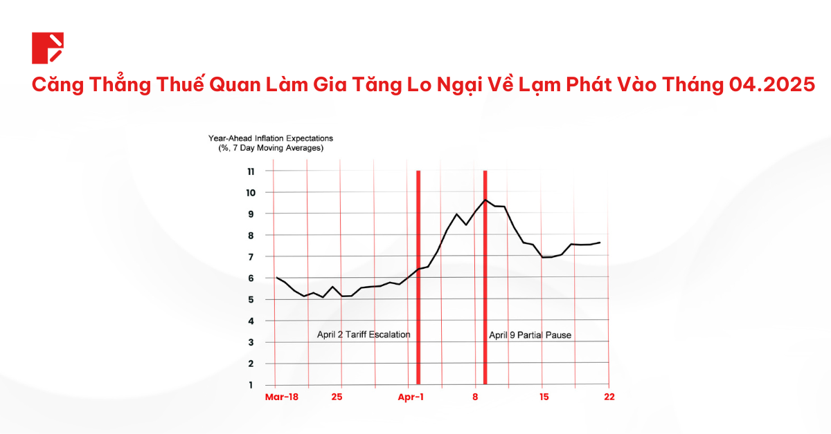 Sau khi Trump tăng mức thuế đối ứng vào ngày 2 tháng 4, mức lạm phát dự kiến bỗng nhiên tăng vọt và chạm tới mức cao nhất kể từ đầu năm 2023. Ngay cả khi đã tạm dừng áp thuế một phần vào ngày 9 tháng 4, thì mức lạm phát dự kiến vẫn còn ở mức cao. Điều này cho thấy rằng một khi nỗi sợ liên quan đến lạm phát xuất hiện, chúng sẽ không biến mất chỉ trong một đêm.