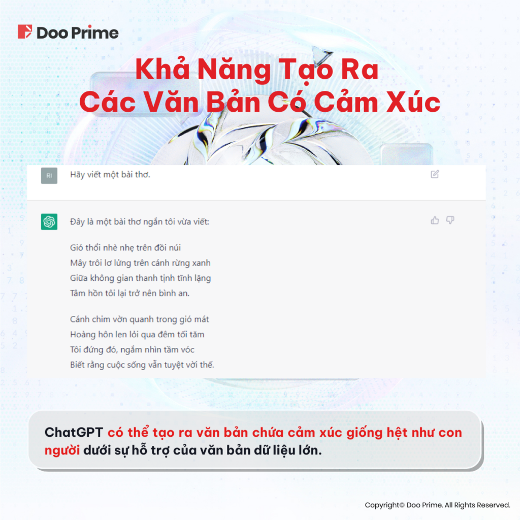 Trái với định kiến rằng AI chỉ giỏi phân tích một cách logic về các vấn đề liên quan đến khoa học chứ không hề có khả năng tạo ra các bài viết dưới góc nhìn nhân văn, ChatGPT có thể tạo ra văn bản chứa cảm xúc giống hệt như con người dưới sự hỗ trợ của văn bản dữ liệu lớn.